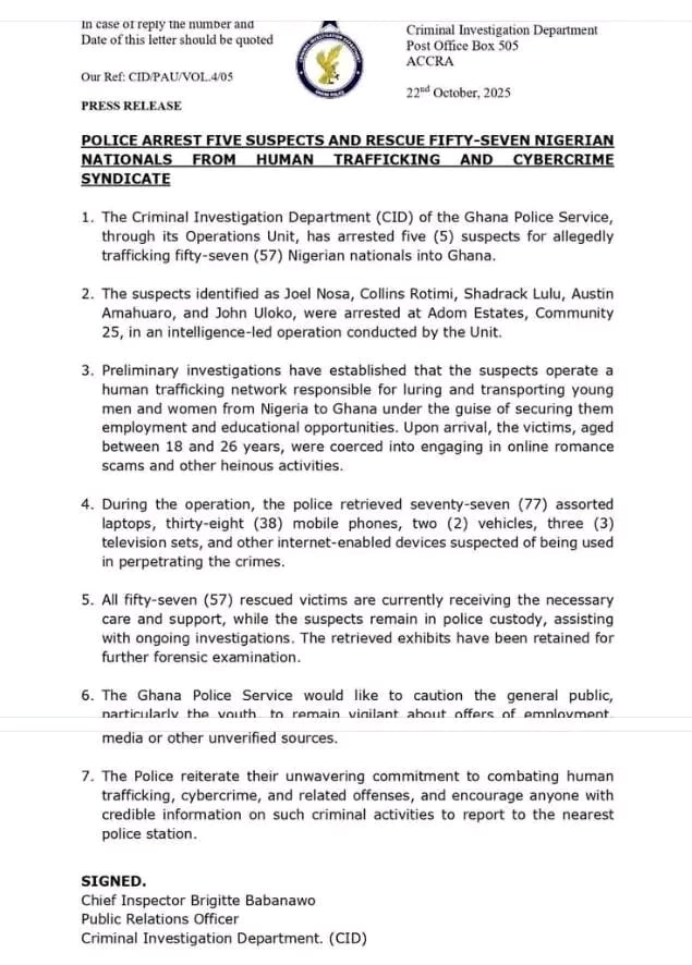 The Ghanaian police have cracked down hard on human trafficking. The Criminal Investigation Department (CID) arrested five Nigerian suspects and released 57 victims during an operation conducted on October 22, 2025, in Adom Estates, Community 25. The five individuals arrested are Joel Nosa, Collins Rotimi, Shadrack Lulu, Austin Amahuaro, and John Uloko. They operated as part of a sophisticated criminal network that lured young Nigerians to Ghana under false promises.
