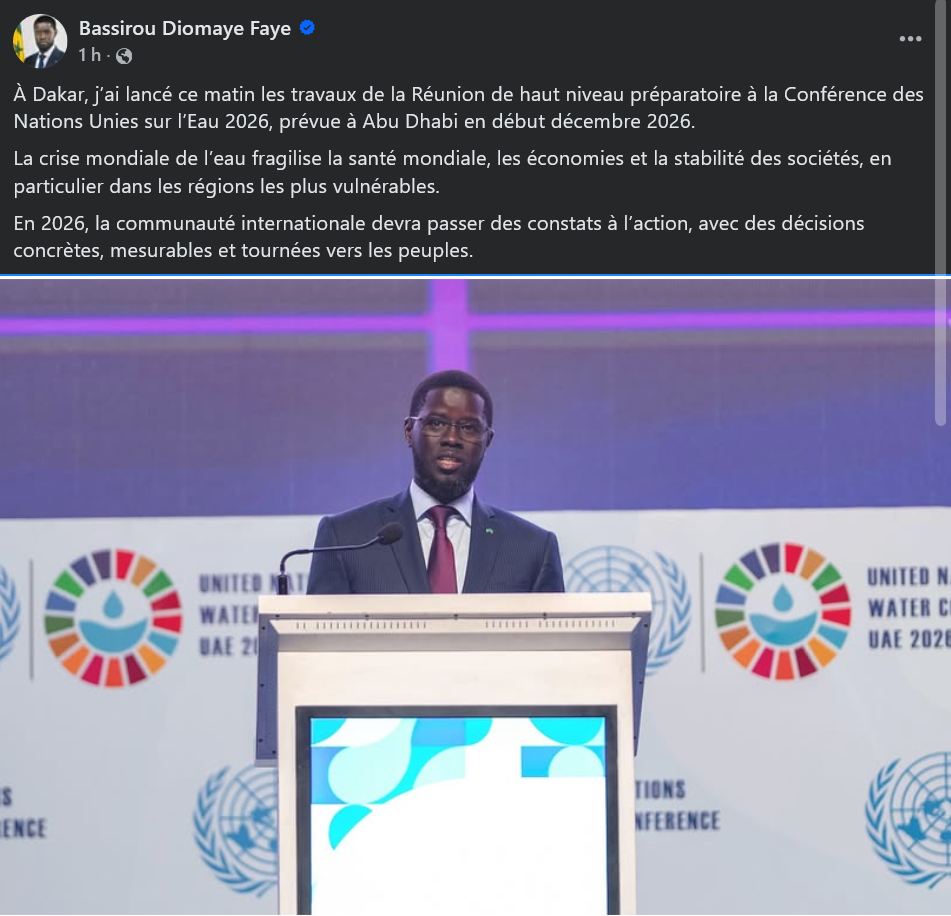 Le président de la République du Sénégal, Bassirou Diomaye Faye, a ouvert ce lundi 26 janvier 2026, au Centre international de conférences Abdou Diouf (CICAD), la réunion de haut niveau préparatoire à la Conférence des Nations Unies sur l'eau.