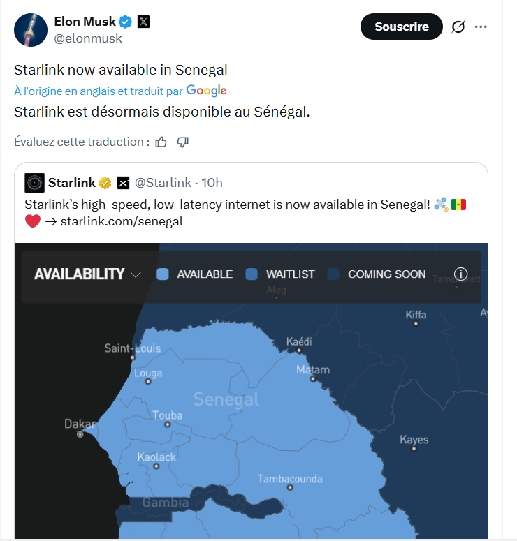 En tout cas je demanderai aux autorités sénégalaise de faire attention à starlink. C'est une société d'espionnage.