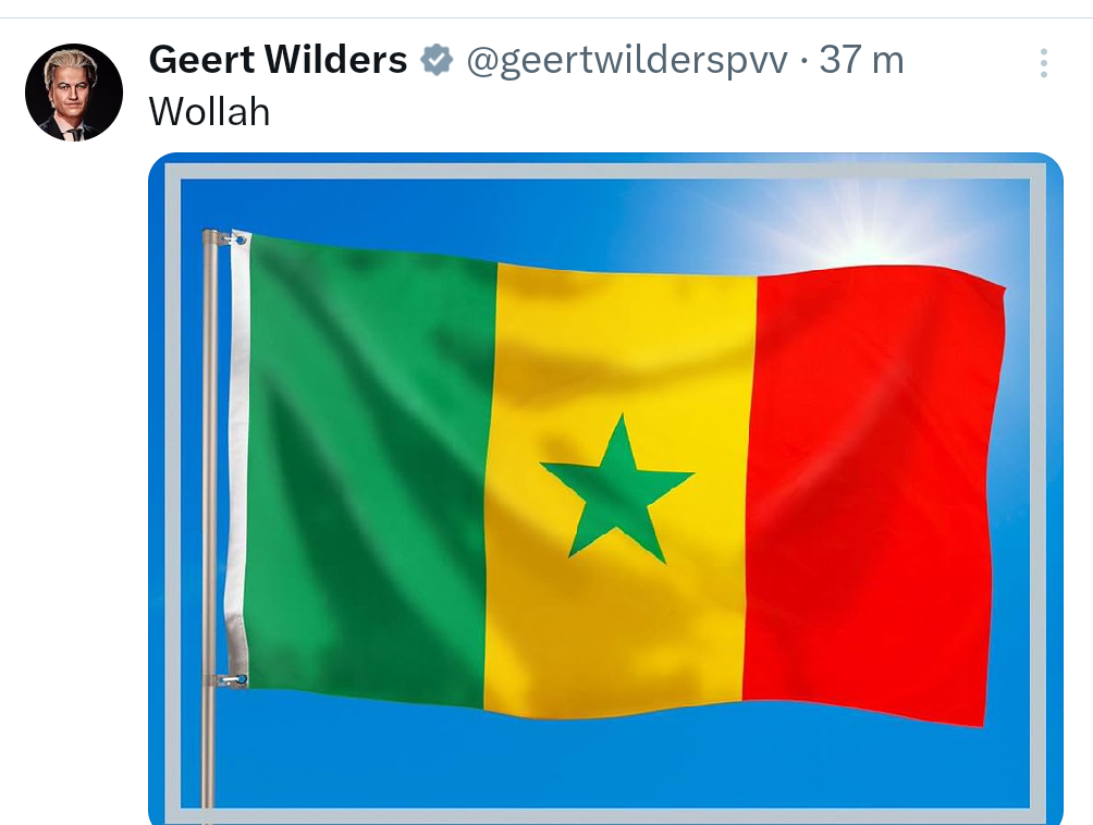 Le sacre des Lions de la Téranga face au Maroc hier soir à Rabat continue de susciter des réactions au-delà des frontières du continent. Le leader de l'extrême droite néerlandaise, Geert Wilders, a surpris en célébrant la victoire du Sénégal sur sa page Twitter par le partage d'un drapeau sénégalais accompagné de la mention « Wollah ».