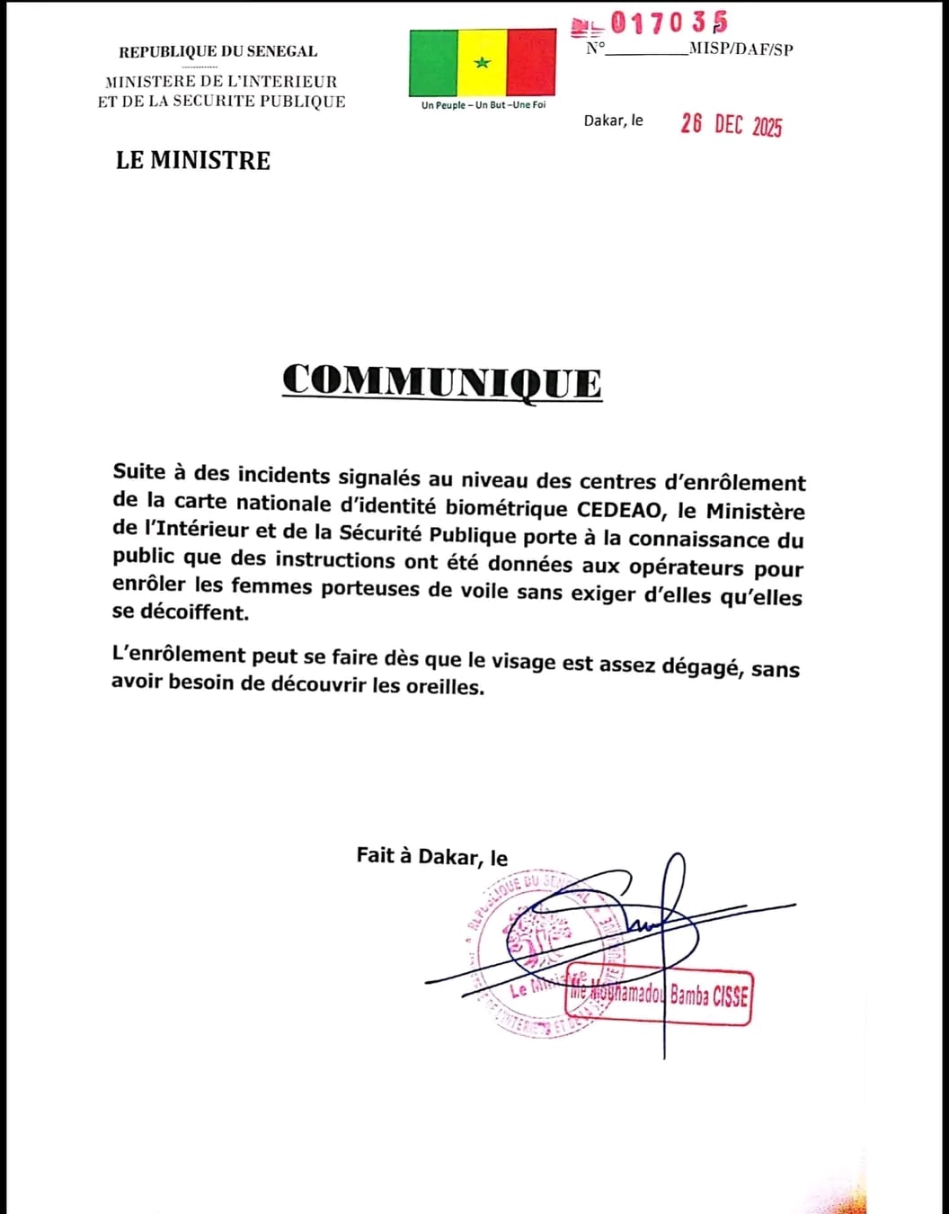 Le ministre de l'Intérieur et de la Sécurité publique, Me Mouhamadou Bamba Cissé, a publié un communiqué officiel clarifiant les conditions d'enrôlement des femmes voilées pour la carte nationale d'identité biométrique CEDEAO.