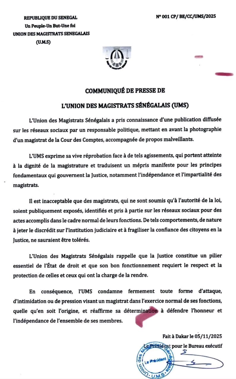 L’Union des magistrats sénégalais (UMS) a dénoncé, dans un communiqué publié ce 5 novembre 2025, une publication diffusée sur les réseaux sociaux par un responsable politique, mettant en cause un magistrat de la Cour des comptes. Cette publication, accompagnée de propos jugés malveillants, a suscité la vive réprobation de l’UMS.
