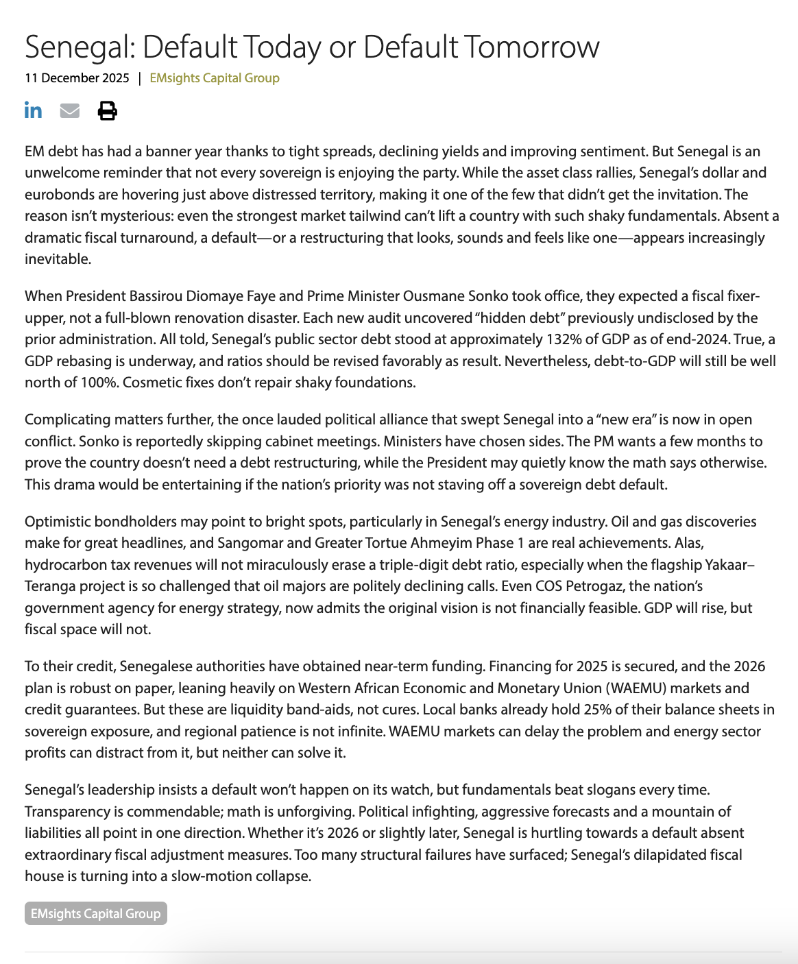 Le document ci-dessous est publié par un investisseur “real money” : un acteur long-only, allocataire du marché primaire, qui ne peut pas monétiser un défaut du Sénégal par une position short. À l’inverse, ce type d’investisseur a généralement tout à perdre à faire publiquement mauvaise presse à un émetteur souverain, notamment en termes de relations avec l’émetteur et d’allocations futures.