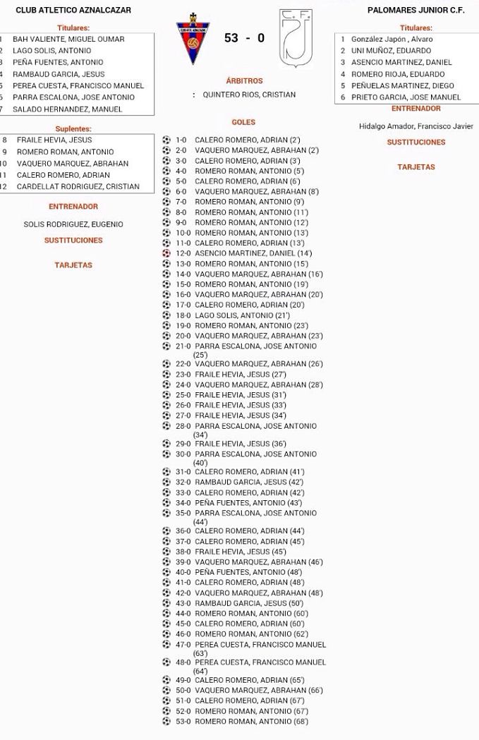 53-0, c'est ce qu'on appelle un score sans appel ! Il ne s'agit pas ici de basket, de rugby ou de handball. Mais bien d'une rencontre de football de jeunes (U12) disputée entre l'Atlético Aznalcazar et Palomares Junior (Andalousie, Espagne).