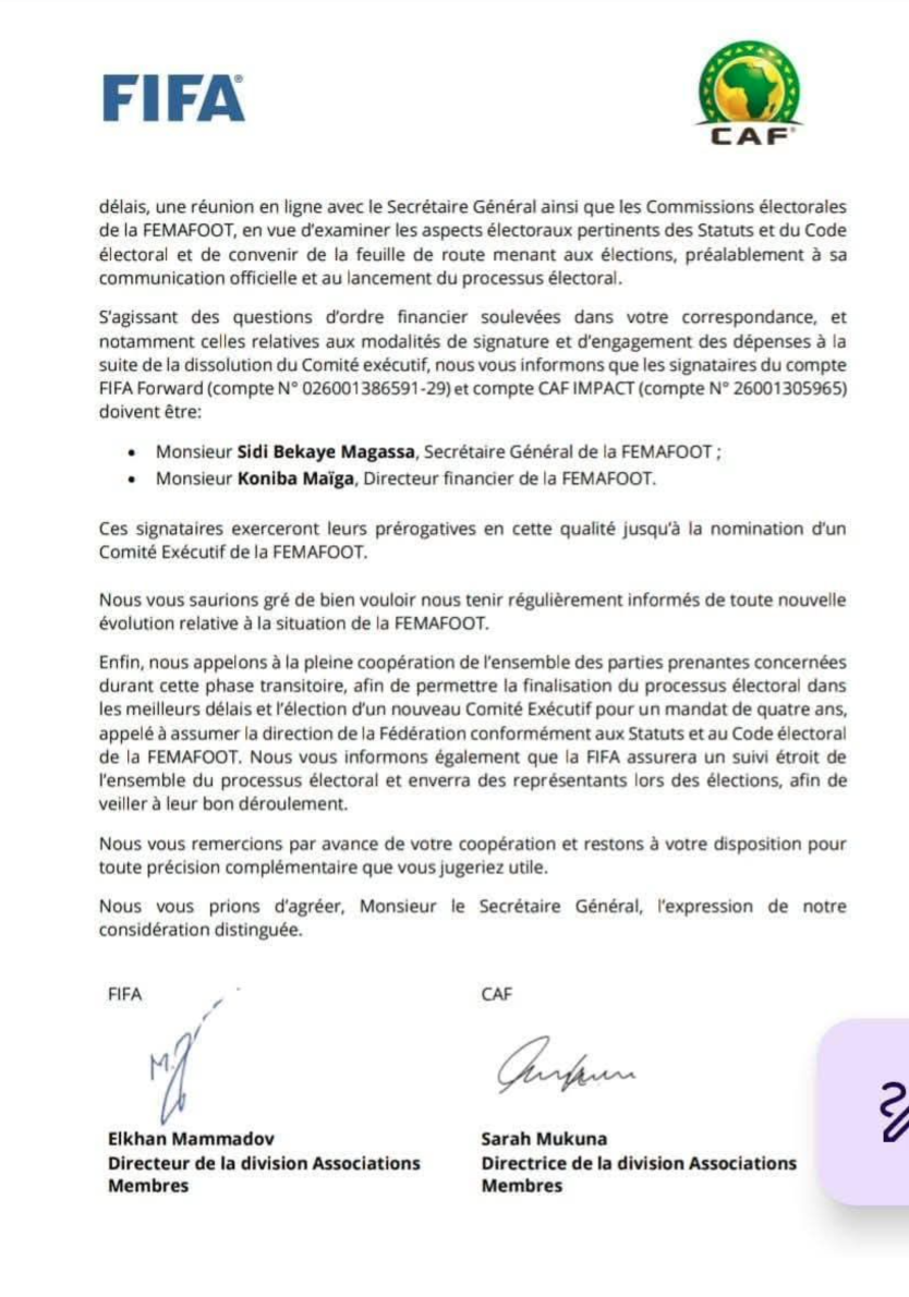Sur le plan financier, la FIFA et la CAF ont également apporté des précisions importantes. Jusqu’à la mise en place d’un nouveau Comité exécutif, les signataires autorisés des comptes FIFA Forward et CAF Impact de la FEMAFOOT sont désignés comme suit : Monsieur Sidi Bekaye Magassa, Secrétaire général de la FEMAFOOT ; Monsieur Koniba Maïga, Directeur financier de la FEMAFOOT.