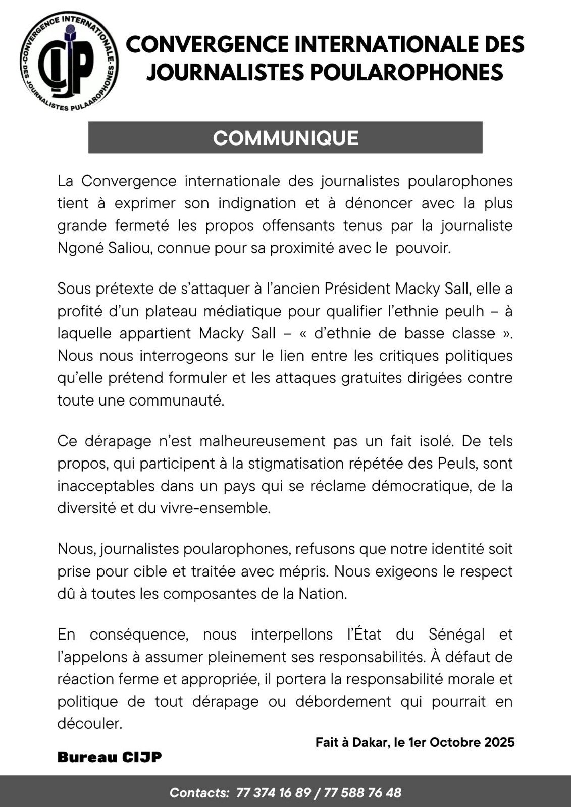 La Convergence internationale des journalistes poularophones (CIJP) a exprimé, ce 1er octobre 2025, son indignation face aux "propos offensants" tenus par la présentatrice de Sans Limites Tv, Ngoné Saliou Diop à l'encontre de la communauté Peulh.
