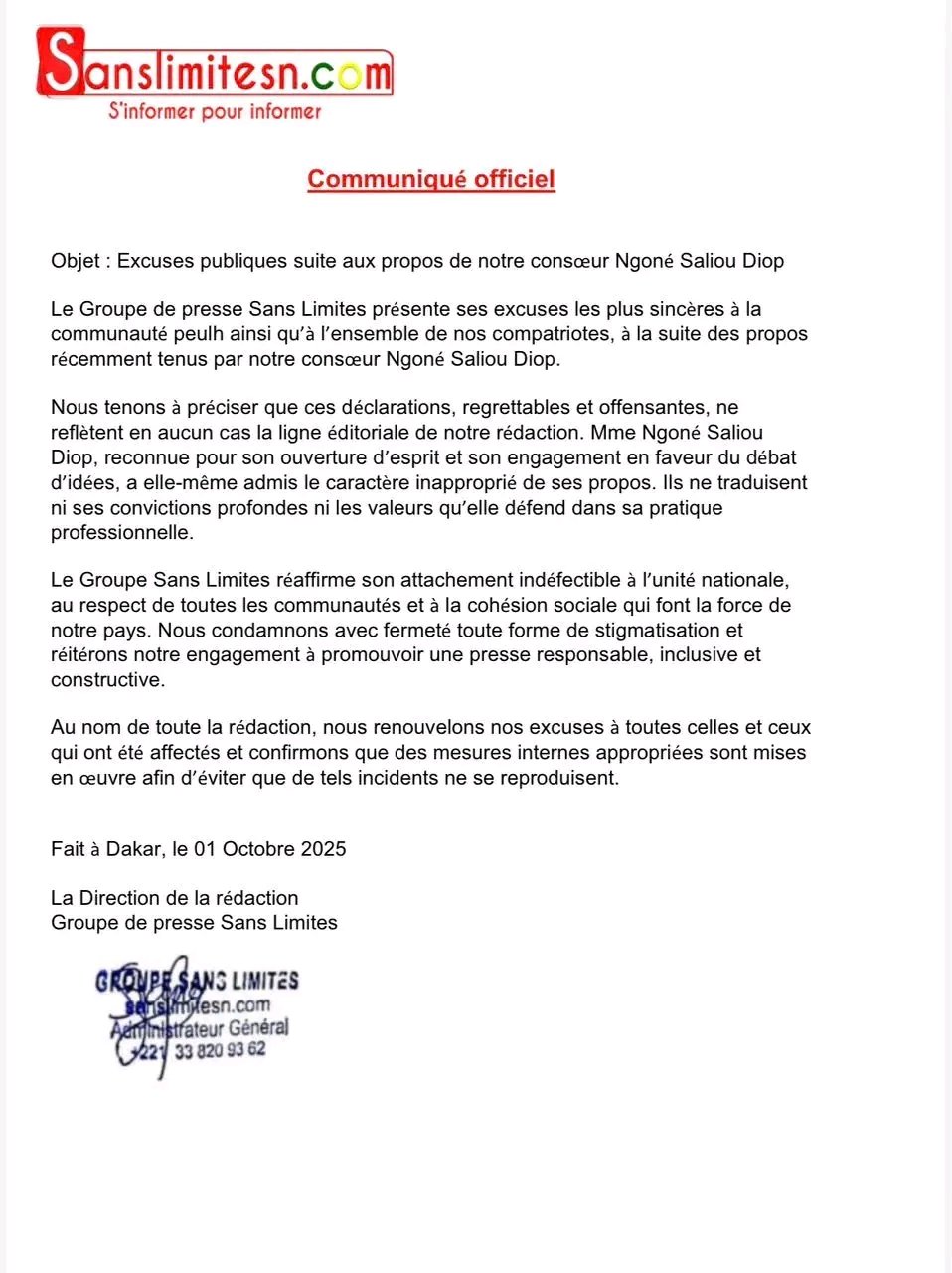 La direction du Groupe de presse Sans Limites a tenu à clarifier sa position suite aux déclarations controversées de Mme Ngoné Saliou Diop, l'une de ses présentatrices.