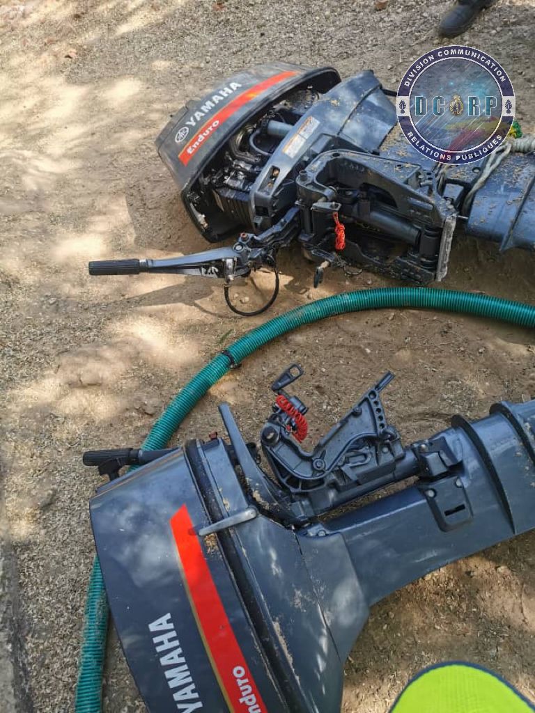 Le matériel saisi lors de cette opération comprend une pirogue de vingt-cinq mètres de long endommagée, deux moteurs hors-bord de soixante et quarante chevaux, cent quarante-neuf bidons d'essence représentant un total de trois mille deux cent soixante-dix litres de carburant, et un groupe électrogène.