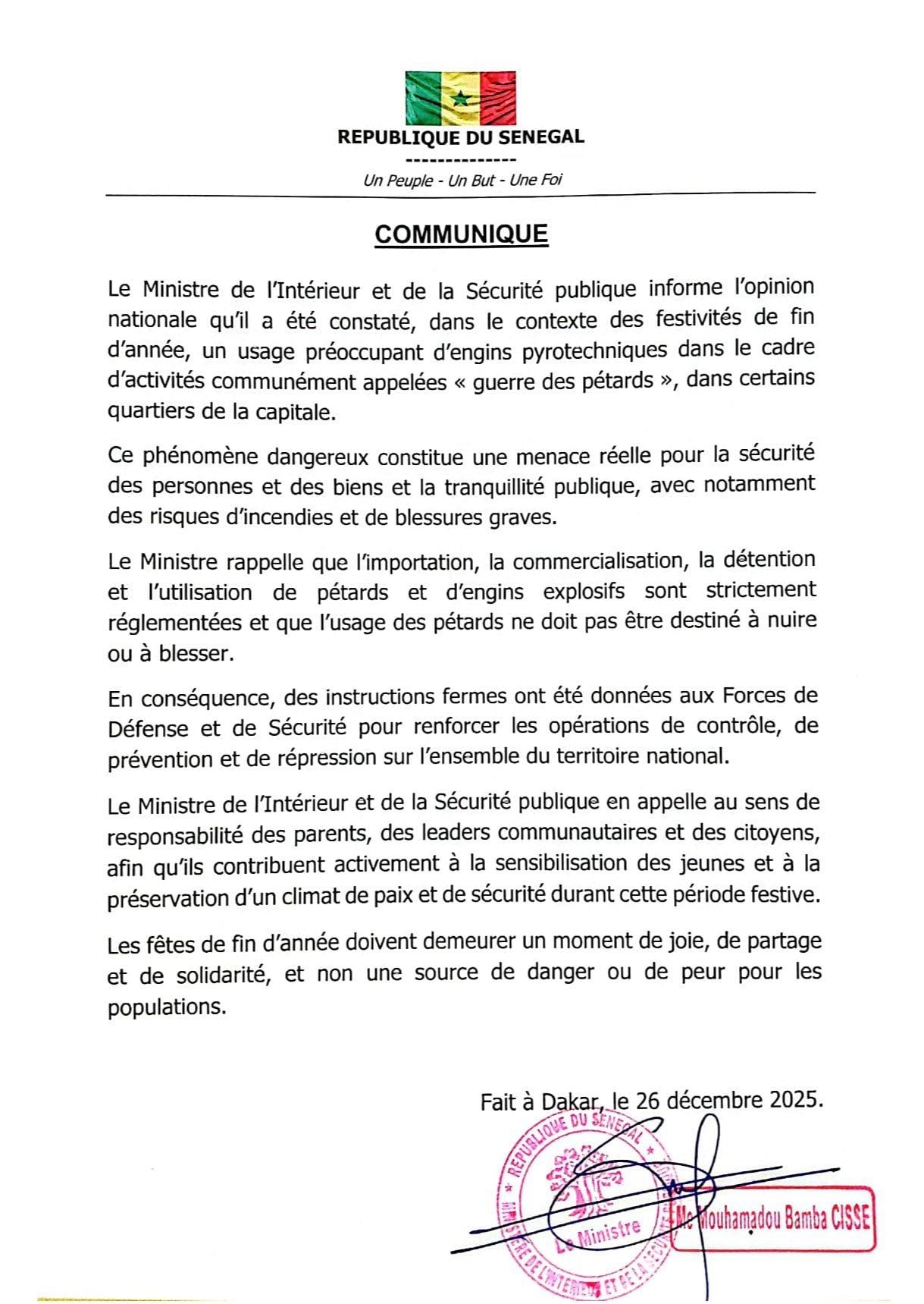 À l'approche des célébrations de la Saint-Sylvestre, les autorités sénégalaises montent au créneau face à une pratique urbaine de plus en plus inquiétante. Dans un communiqué officiel daté du 26 décembre 2025, le Ministre de l'Intérieur et de la Sécurité publique a tenu à alerter l'opinion nationale sur « un usage préoccupant d'engins pyrotechniques dans le cadre d'activités communément appelées "guerre des pétards", dans certains quartiers de la capitale ».