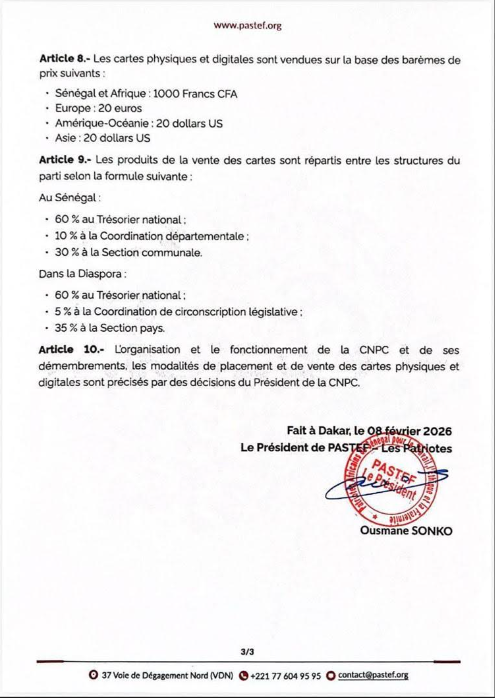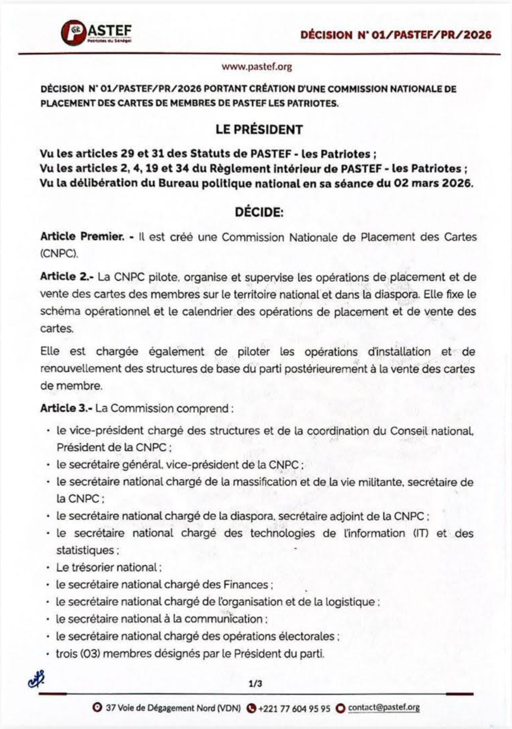 En effet, dans une décision en date du dimanche 8 mars (soit 24 heures après l’A.G de DiomayePrésident), Ousmane Sonko a informé de la création de la Commission nationale de placement des cartes (CNPC). L’organe est chargé, entre autres, de « piloter, organiser et superviser les opérations de placement et de vente des cartes des membres sur le territoire national et dans la diaspora », selon un « schéma » et un « calendrier » qu’il fixera.