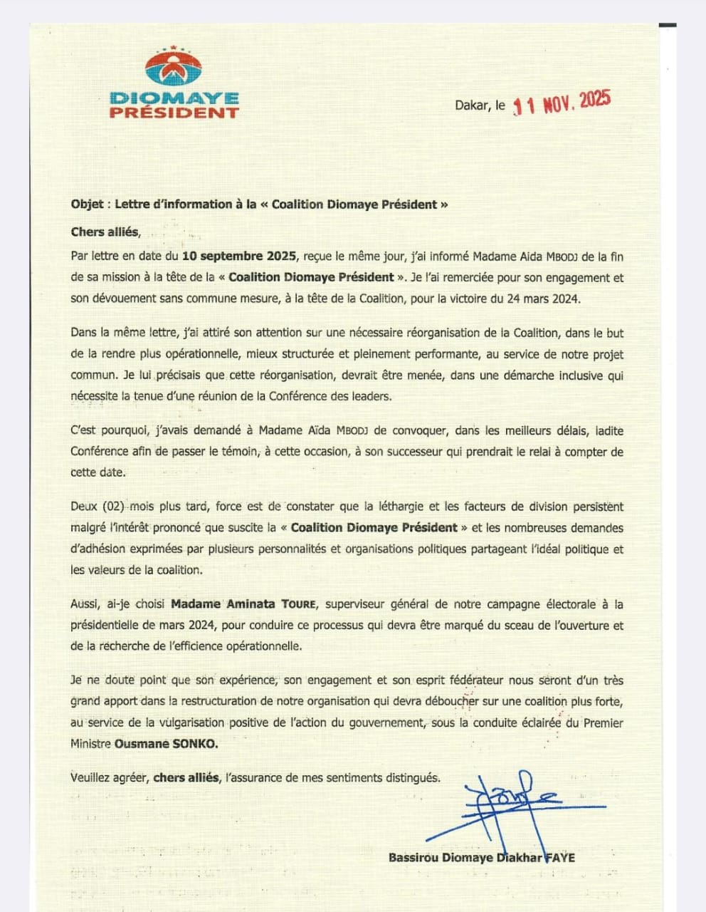 Dans sa lettre d'information, datée du 11 novembre 2025, le Président Faye rappelle qu'il avait informé Madame Aïda Mbodj, dès le 10 septembre 2025, de la fin de sa mission à la tête de la Coalition. Il la remercie pour son engagement et son « dévouement sans commune mesure » pour la victoire de mars 2024.